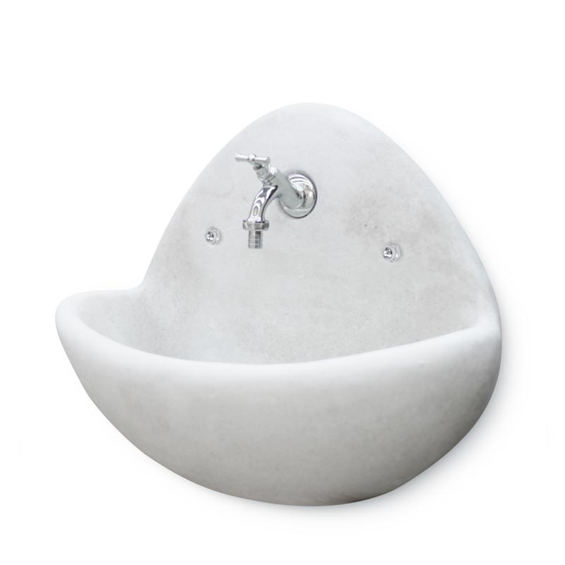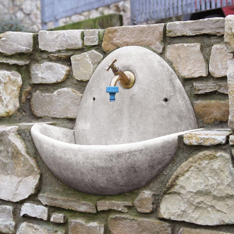 Fontana bacinella a muro, realizzata in cemento nella finitura liscia bianca oppure anticata in grigio o nocciola.