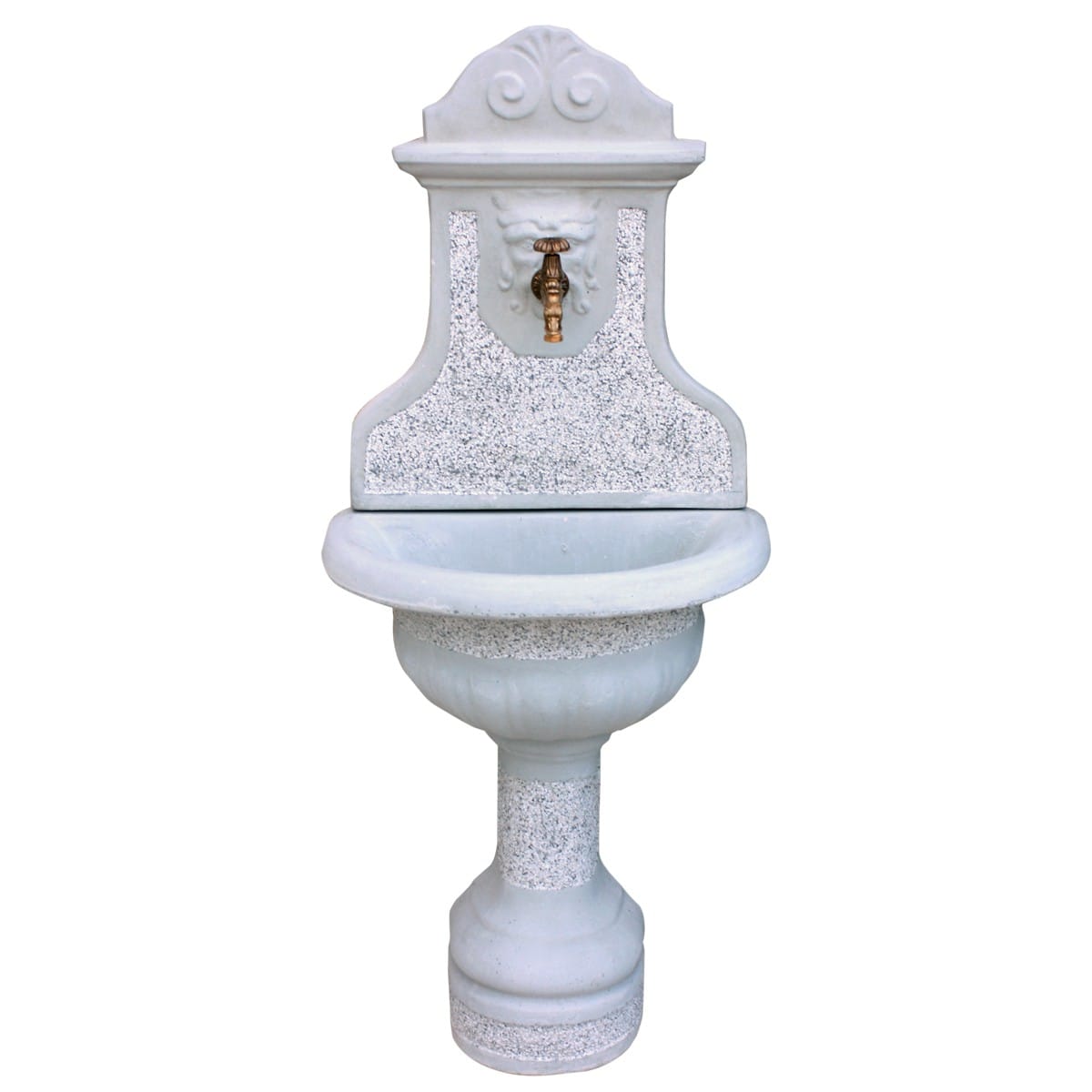 Fontana a muro in cemento e granulato di marmo. Realizzata con finitura martellinata disponibile in cemento rosa oppure in cemento grigio con granulato bianco/rosso/nero.