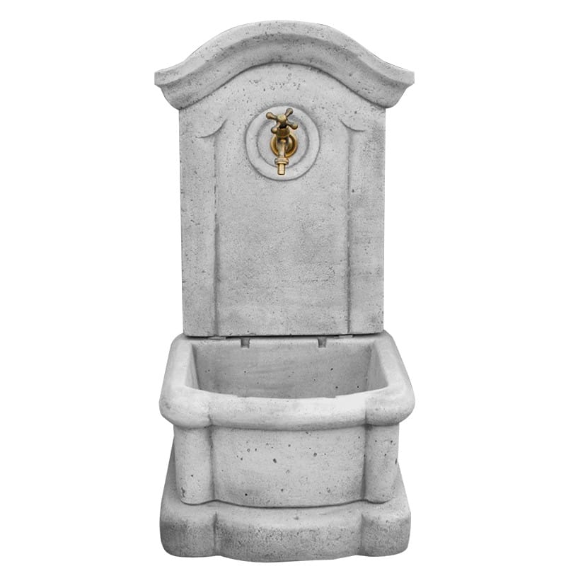 Fontana a muro in cemento e granulato di marmo. Realizzata con finitura liscia bianca e anticata nelle colorazioni: grigio o nocciola.