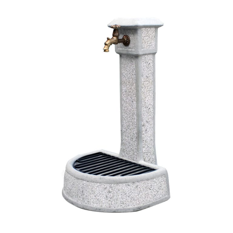 Fontana vedovella in cemento e granulato di marmo, realizzata nella finitura martellinato. Disponibile nelle varianti colore:
