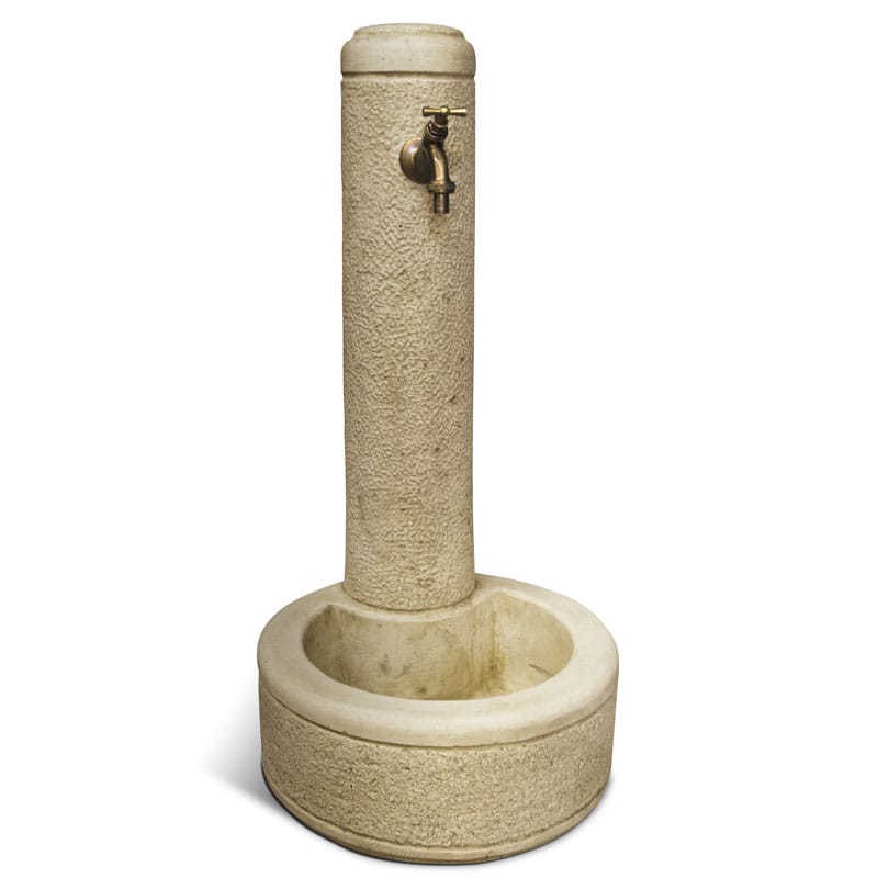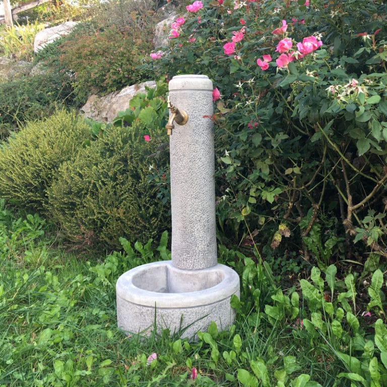 Fontana vedovella in cemento, disponibile nel colore bianco oppure con anticatura grigia o nocciola.