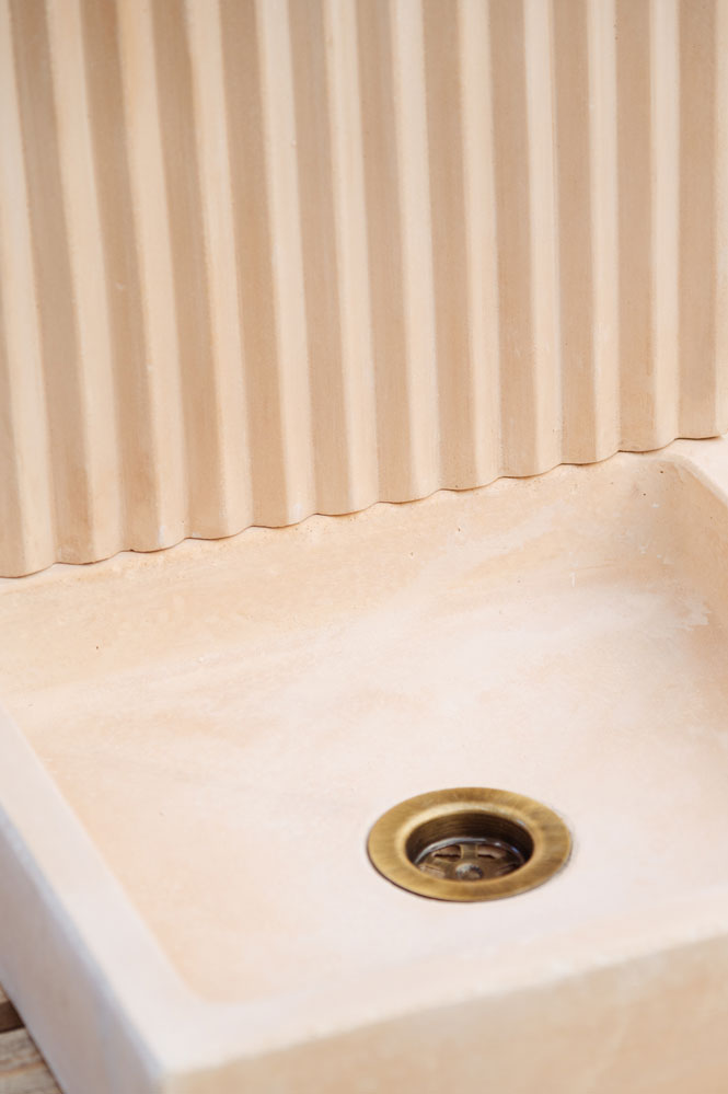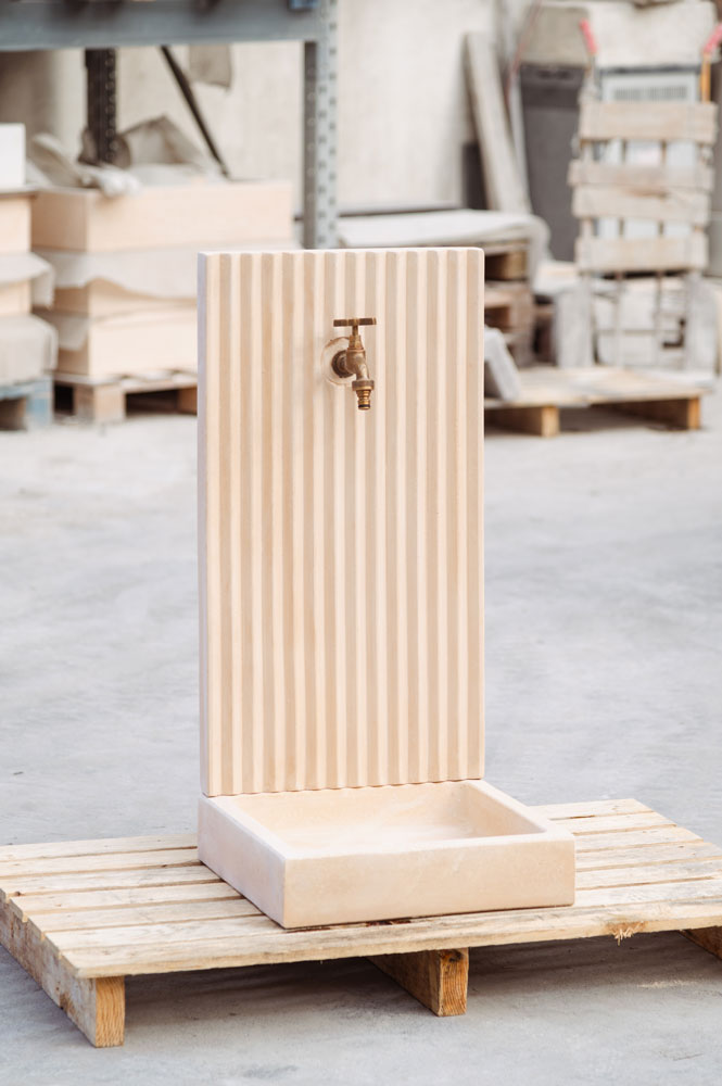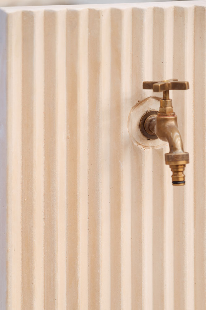 Fontana da parete in calcestruzzo composta da due pezzi: vaschetta e paraschizzi. Il retro della fontana non presenta scanalature; la predisposizione del carico dell’acqua deve essere posizionata ad un’altezza di 65 cm rispetto al piano di appoggio a terra.