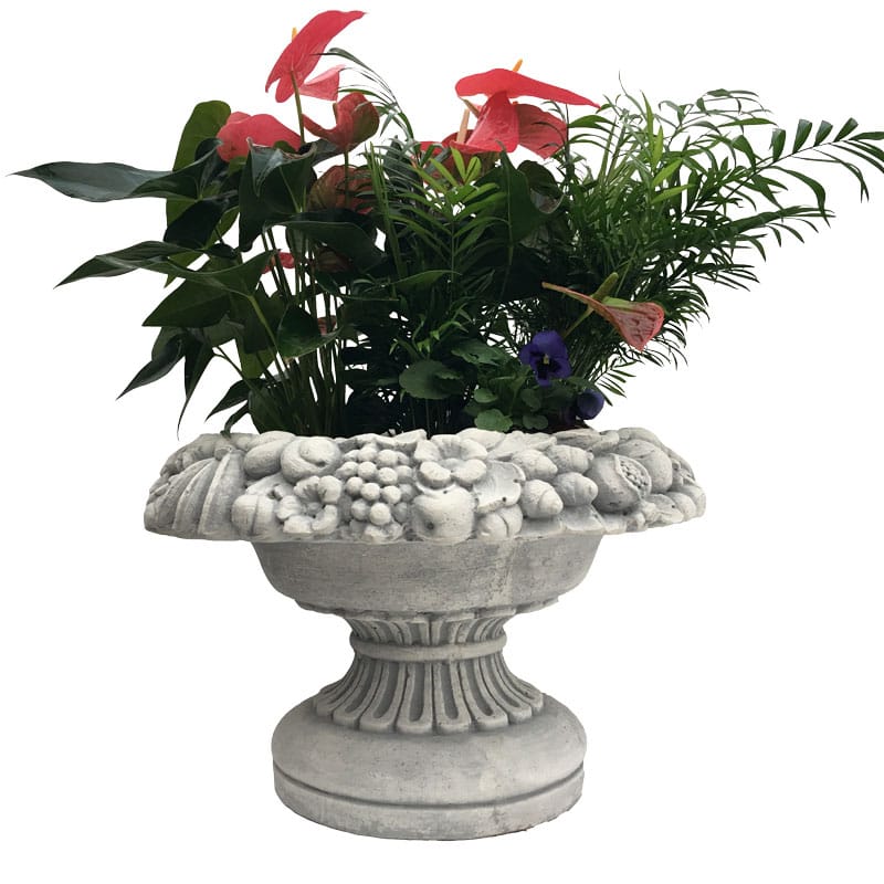 Vaso ornamentale in cemento e granulato di marmo. Realizzabile nei colori bianco liscio oppure anticato grigio o nocciola.