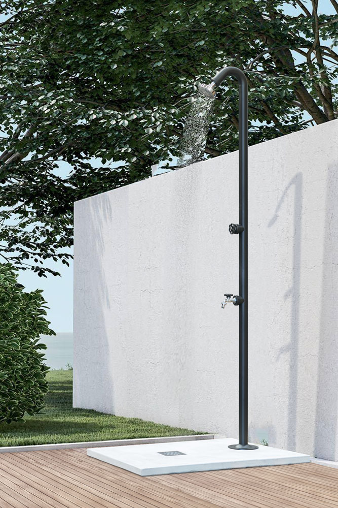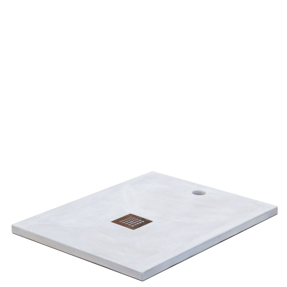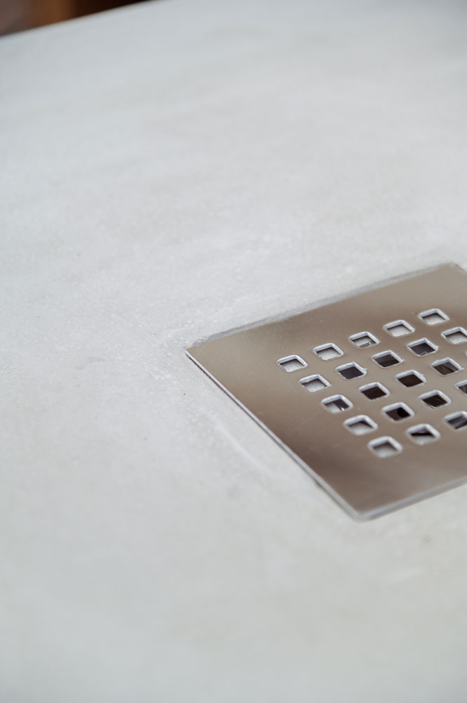 Piatto doccia in calcestruzzo, incluso di griglia e piletta di scarico. La sua superficie liscia aggiunge eleganza alla solidità strutturale, creando una base resistente.