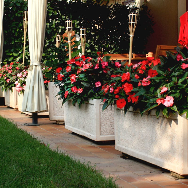 Fioriera rettangolare in cemento rosa o grigio. Disponibile nelle misure 102×42 e 82×42