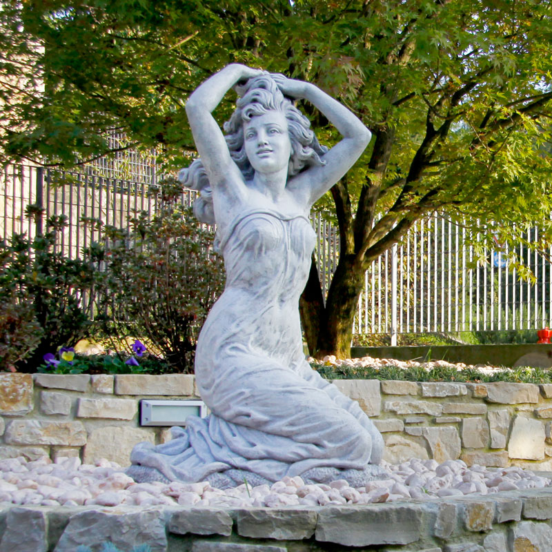 Statua per giardino in cemento e granulato di marmo. Realizzata in cemento bianco, nelle finiture liscio oppure anticato grigio o nocciola.