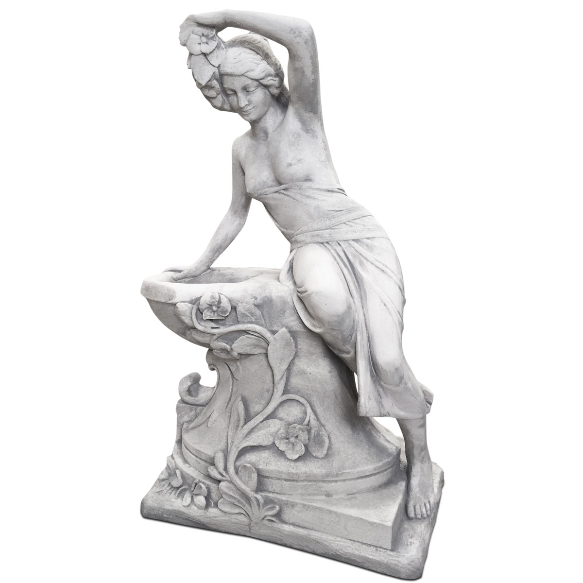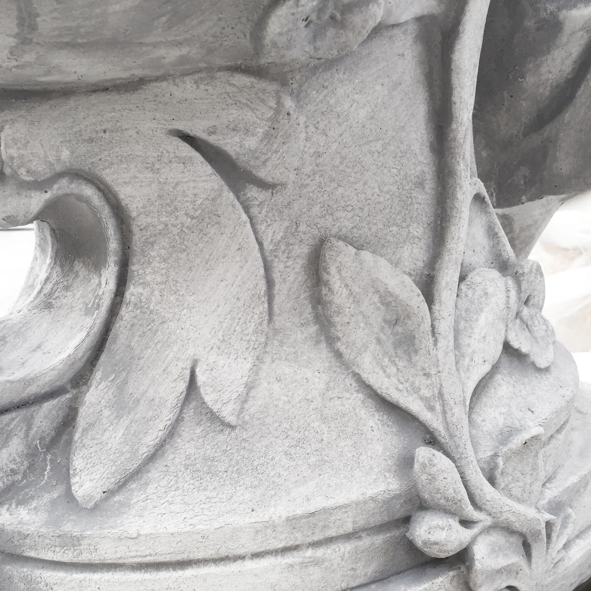 Statua per giardino Flora con porta vaso. Realizzata in cemento, granulato e polvere di marmo .